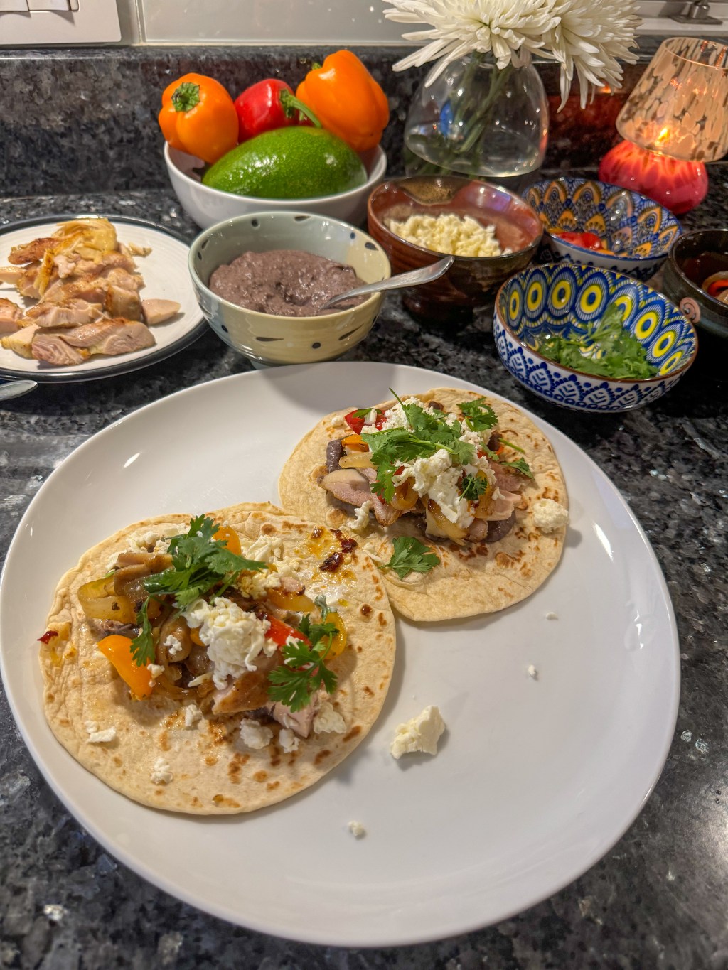 - Season the meat. In a pan, heat oil and cook peppers and onions until translucent and soft. Set aside. In the same pan, cook the chicken until cooked through, and in the meantime, set the bar. Place each topping in a separate bowl and have a spoon for them. Heat the tortillas before serving. I heat mine in a stainless steel pan without any oil, but you can use vegetable oil.