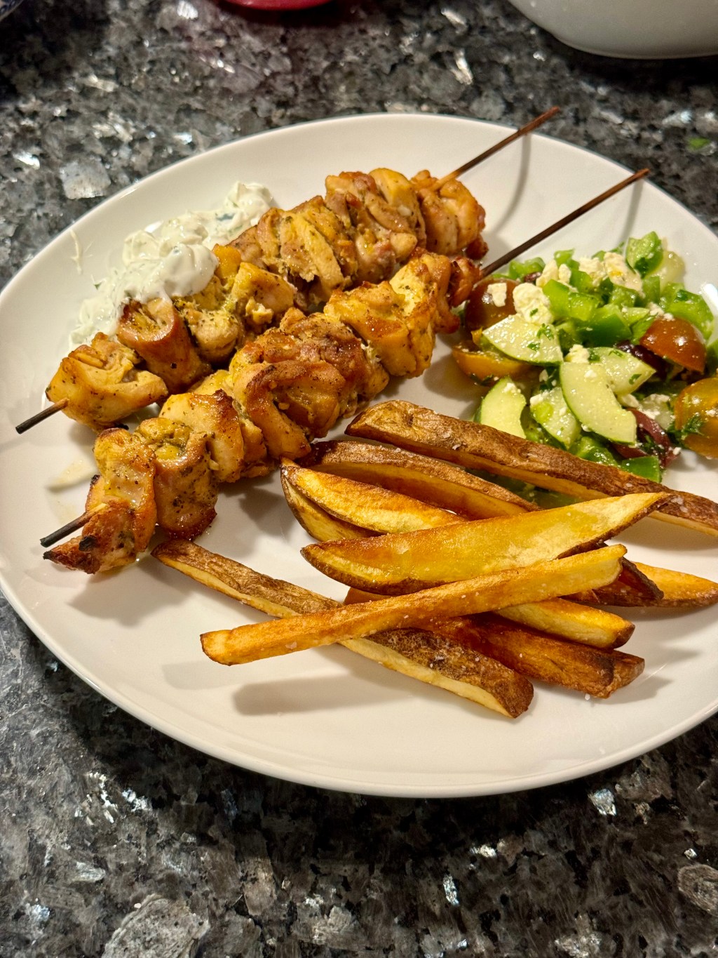 Transfer the grilled chicken souvlaki to a platter and serve with the Tzaziki, Greek Salad and Home Fries.