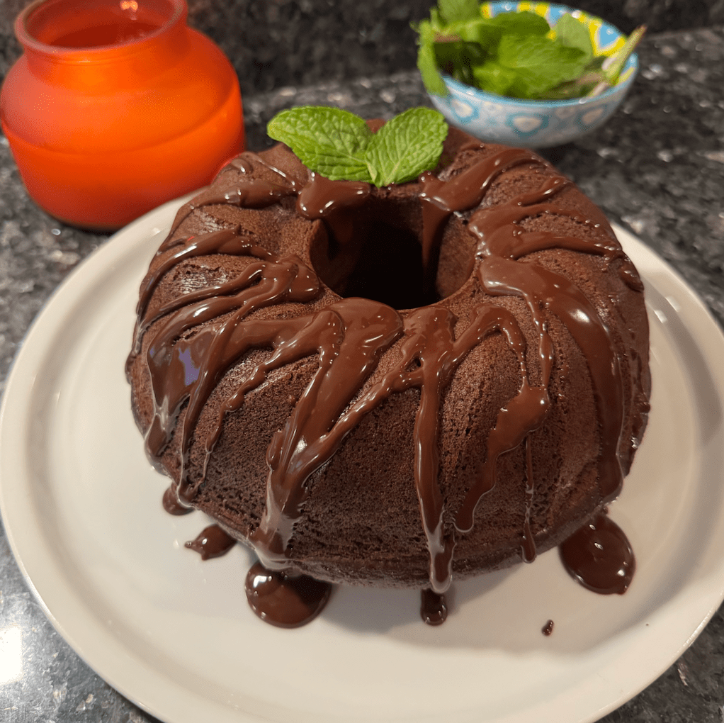 I finish the cake with a chocolate glaze. You can also sprinkle finely chopped chocolate mint on top.