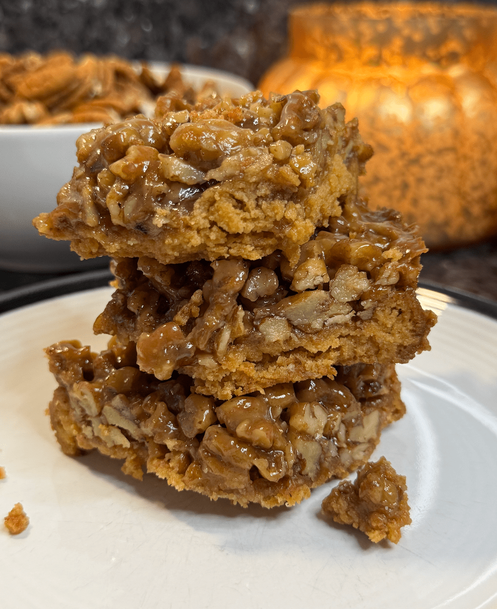 Pecans and caramel are always a good idea, but adding pumpkin spice to the pecan squares recipe makes it even better! A dollop of vanilla ice cream was the only thing missing!